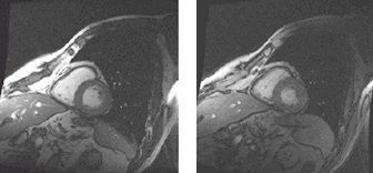 Figure 1. Cardiac short axis image comparison: 2D FIESTA (left) and FastCINE (right)