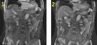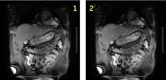 Figure 3. 2D Fat SAT Fiesta with 2 slices and MPH in interleave mode. 1 = 1st phase, 2 = 2nd phase