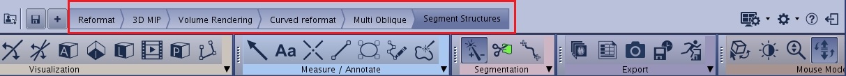 - Curved reformat automatically opens the Trace panel that guides you through the creation of a curved reformation and switches the upper left viewport to Curved type
