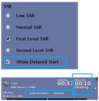 - Allow Delayed Start maximizes the system performance short-duration SAR by using 4 w/kg for scans shorter than 3 minutes.