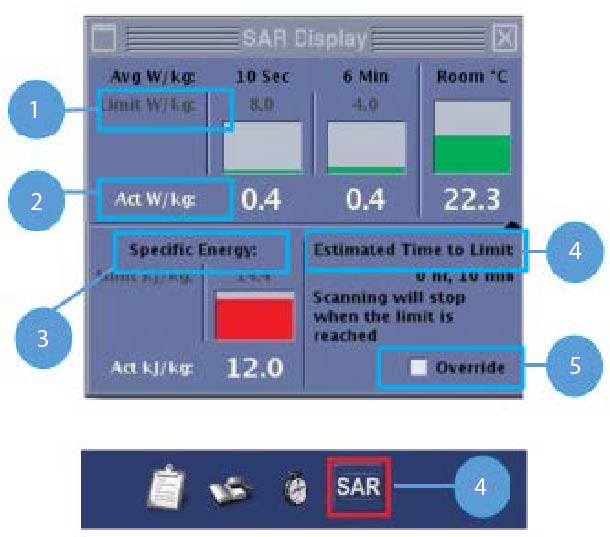 | 3 | Specific Energy: Cumulative SAR across scans for a patient that has occurred within 2 hours. The value reads 0.0 when the patient has not been scanned during the last 2 hours. Usually, a rest time of 2 hours is required to dissipate the absorbed energy from any previous MR scan.