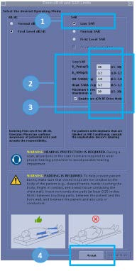 - If you select No, the Accept button is active.Note: For some customers, when Normal SAR mode is selected, there is no longer a prompt regarding an MR Conditional implant. When selecting Normal SAR mode if the patient has an implant, DO NOT select Allow Delayed Start.