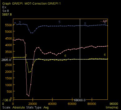 Select the image number (or time, b–value, or ppm) by middle-clicking and dragging the cursor to the left or right on the graph view or moving the cursor to the desired location and left-click. The vertical bar follows the cursor, and the horizontal bar automatically indicates the corresponding image intensity value.