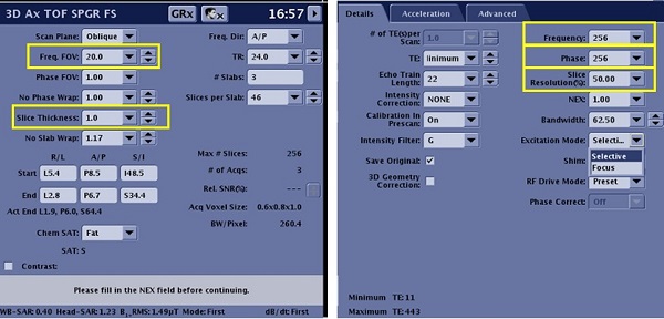 Effective resolution (not shown)It is only displayed for Spiral-based acquisition and DWI PROPELLER. It is displayed in millimeters and based on the acquired resolution and the reconstruction resolution.