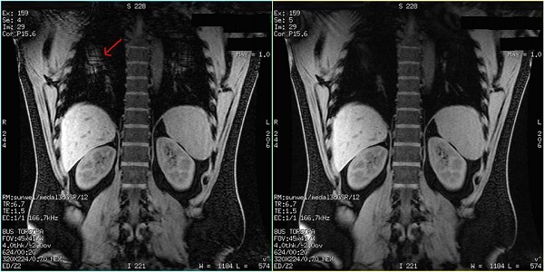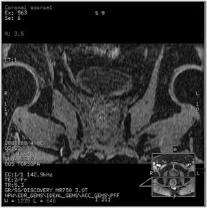 Figure 6. Example of: Coronal reformat of sagittal LAVA-Flex scan with ARC Slice = 2 (R/L). Coil coverage in R/L is much larger than the scan coverage in R/L direction resulting in noise amplification due to parallel imaging technique.