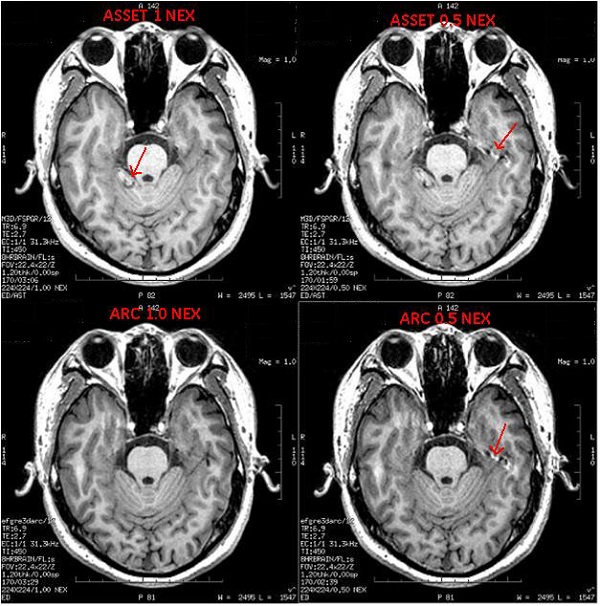 Figure 2. ASSET 1 NEX images demonstrates aliased ear artifact in the center of the image while ARC image projects aliased anatomy to the edges of the FOV. Both 1/2 NEX ARC and ASSET images are sensitive to in-flow artifacts on axial images.