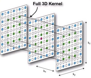 Figure 3. Full 3D Kernel: Blue = acquired point, white = unacquired point, green = source point, pink = target point
