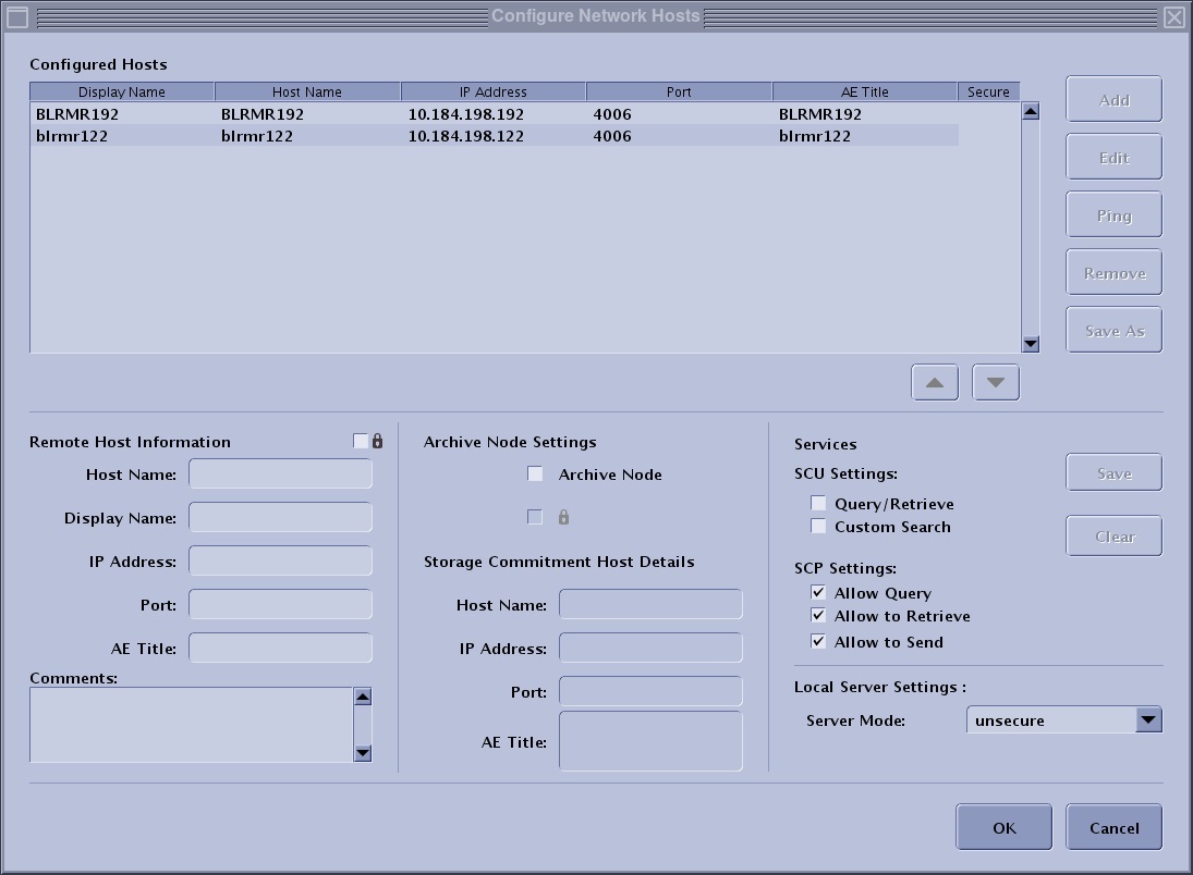 - Select the Archive Node option to place the selected node in the Archive Node List located at the bottom of the Image Management work area. Only devices or nodes that have this option checked can be used as an archive device. Not all hosts can be used as archive nodes (for example, another MR system cannot be used as an archive node, but a PACS system can be used as an archive node)