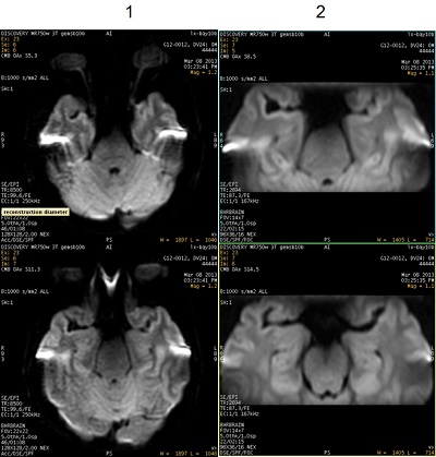 | 2 | DWI images acquired with Excitation Mode: Focus. Note the increased resolution due to less magnetic susceptibility distortion effect. |