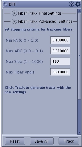 ) displays additional DTI FiberTrak selections.