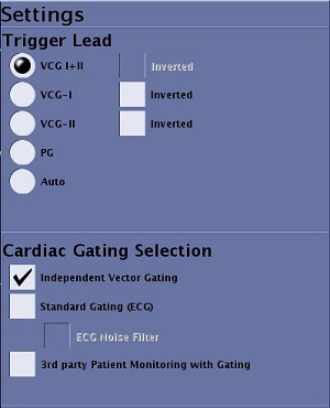 - Select the cardiac gating lead type: VCG, Standard or third party.