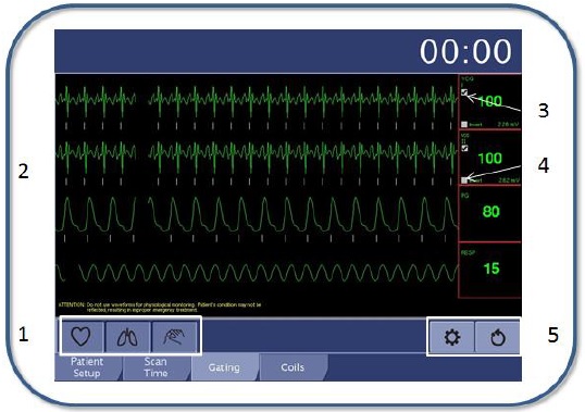 | 2 | Waveform display: ECG gating, peripheral gating, and respiratory. |