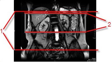 1Top localizer image: Coronal localizer with IR two bands applied over the lungs.