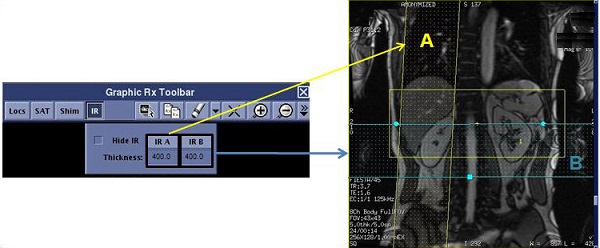 1Coronal localizer with an IR band placed to the right or left well out of the FOV. Do not move the IR band superior or inferior as that will suppress signal from blood.