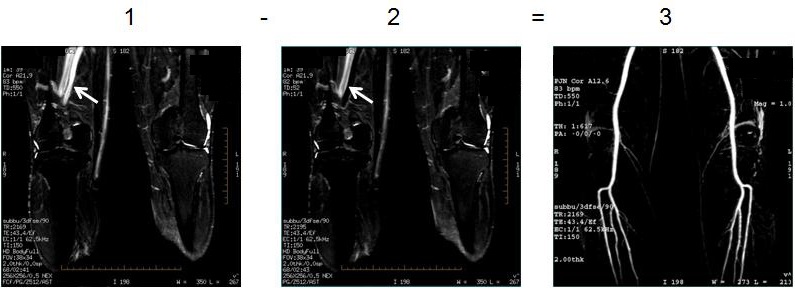 The signal produced from arterial flow is sensitive to the cardiac cycle. During systolic phase, arterial flow is fast resulting in a dark signal. During diastolic phase, arterial flow is significantly slower resulting in a bright signal. Unlike arterial flow, venous and background signal are relatively insensitive to the cardiac cycle. Subtraction of the systolic slab from the diastolic slab results in the visualization of the arteries with good background suppression. A STIR pulse can be applied to both the systolic and diastolic acquisition for additional fat suppression.