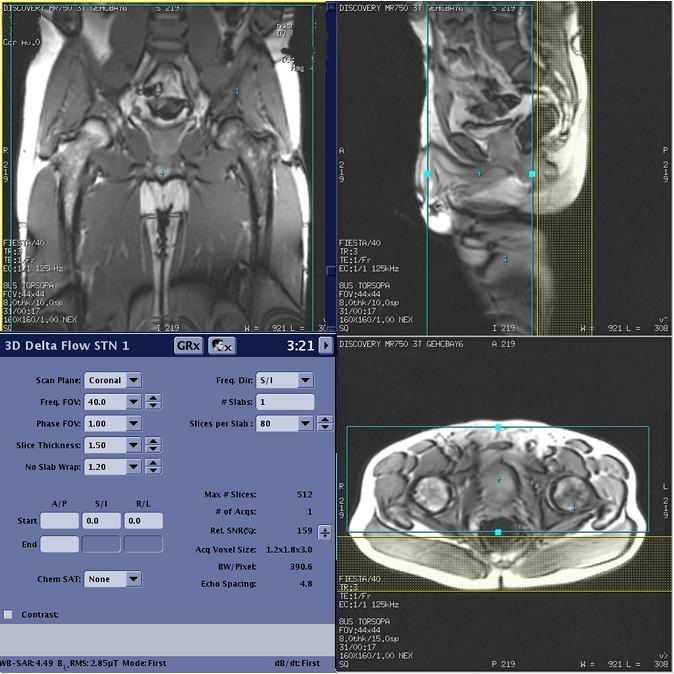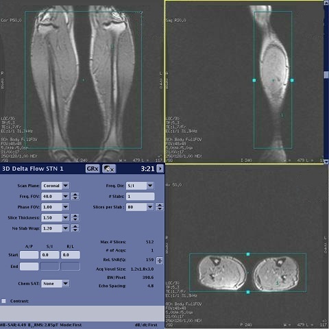 - With 3.0T systems, use a phased array coil to acquire signal from fast flowing iliac arteries. DeltaFlow is only suggested for the lower leg station at 3.0T. Other stations can result in image quality degradation due to B1 inhomogeneity effects. If you acquire a multi-station scan, be certain to carefully center each slab, evenly load the body coil, and use ASSET for the iliac stations. Given that the B1 inhomogeneity effects are very sensitive to anatomical body (weight and geometry), it may not work on every subject.