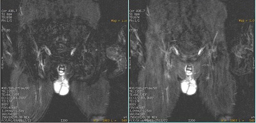 Figure 7. Left is pelvic image with no posterior SAT, right is image with posterior SAT pulse