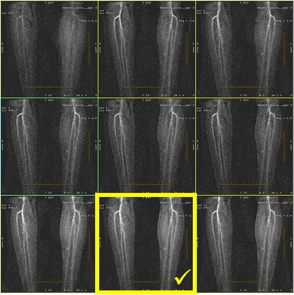 - Graphically prescribe a single coronal slice with the maximum allowed slice thickness (typically 150 mm) located over the vessels of interest.