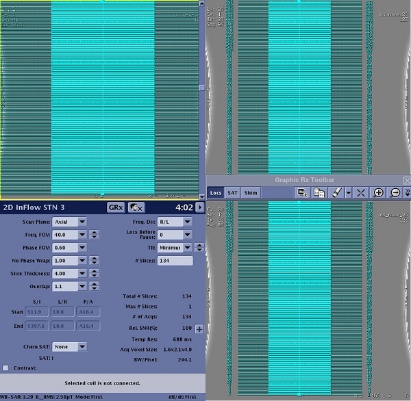 • Graphic Rx: Prescribe the slices from inferior to superior for runoff scans and superior to inferior for carotid scans to avoid saturation of blood. Spatial Saturation should not be prescribed graphically or explicitly to make it concatenated.