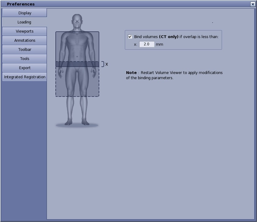 in the upper right corner. From the Preferences menu, click Loading. The Loading tab is used to bind CT volumes.