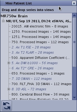 to open the list of series for the currently active exam. The series already present in the session are shown in italics. To add series not present in the session, select a series from the list and drag and drop it into any viewport.
