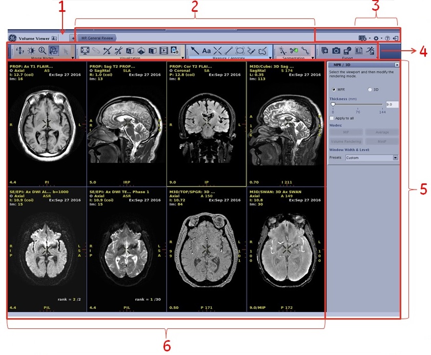 Open MR General Review, 3D Viewer, Reformat or READY View to display the Volume Viewer work area.