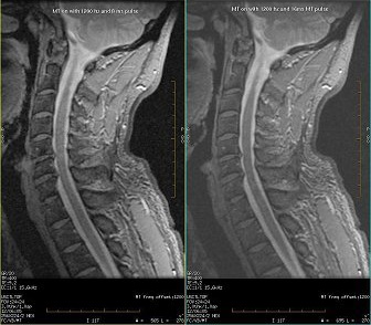 Figure 1. MT C-spine with 1200 Hz offset, 8 msec (left) and 1200 Hz offset , 16 msec (right)