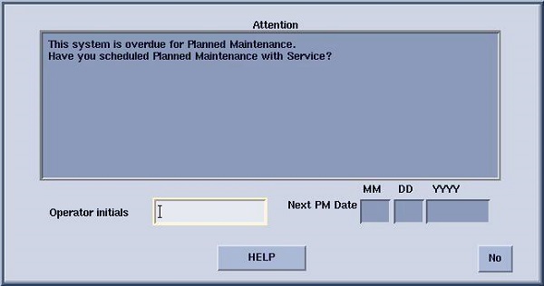 Object ID: 00000018WIA30837870GYZTopic ID: id_40025852 Version: 1.0Date: Jun 17, 2021 12:11:08 PMPlanned Maintenance overdue This message displays if the Planned Maintenance interval has been too long.Figure 1. Planned maintenance overdue Attention screen