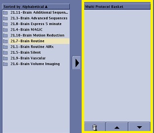 | The Multi Protocol Basket lists the series that have been pulled from the Protocol List. Series from separate libraries and protocols can be added to the Multi Protocol Basket list. The arrows and trash can at the bottom allow you to move or delete items in the list.