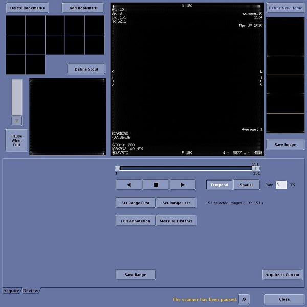 Click Add Bookmarks to save the plane, location, and image contrast of the image currently in the Review tab viewer as a bookmark thumbnail for later recall. Bookmarks can be created and deleted in both the Acquire and Review tabs.
