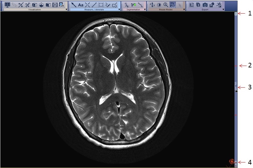 | 3 | ![]() | Click and drag from the center of the Scroll icon (1) to select an image. To page you can also press the Ctrl key while moving the mouse up and down. Click and drag either side buttons (2) to change the thickness of the MIP image. Slice thickness adjustment is not available on 3D views. |