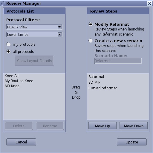 • The Protocol List is a list of all preset layout protocols, both user and GE created. You can delete or Rename a protocol, and filter the list of protocols by selecting my protocols or all protocols option buttons.