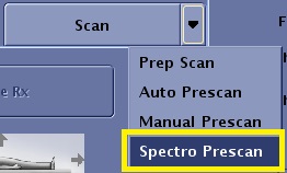 When a spectroscopy prescription is saved in the workflow manager, the Spectro Prescan button displays from the Scan menu.