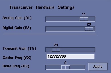 The sliders and type-in entry fields in the Transceiver Hardware Setting area provides access to the transceiver hardware settings – center frequency, and transmit and receive gains – that are normally determined and set by the Auto Prescan process or on the Manual Prescan screen.