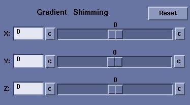The Gradient Shimming area allows you to adjust the linear (x, y, and z) shims by adjusting the corresponding gradient currents. Sliders for each gradient current can be adjusted in a small range around the current settings or you can enter gradient current offset values in the X, Y, and Z text boxes.