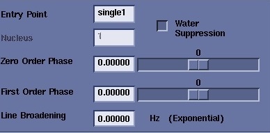 The Start button starts the acquisition of raw spectral data using the scan prescription that you entered on the Scan Desktop, with the exception of using the data acquisition mode specified by the Entry Point selection, typically single1 or avg. With the default single1 Entry Point selection, data are continuously acquired and displayed until Stop is clicked. Depending on the value of NEX, a single excitation (NEX = 1), or an average of several excitations (= NEX, where NEX is 2 or more), is acquired, displayed, and then overwritten by the next excitation(s). With the single1 entry point, you can use the Zero Order Phase and First Order Phase sliders and/or the text boxes to correct the phase of a Pure Absorption display. It is often desirable to smooth or to enhance the resolution of a spectroscopy data set by multiplying the raw data with a windowing or filter function. The filter function is an exponential of the width specified by the entry (in Hz) in the Line Broadening text box. A copy of the raw data is multiplied by the exponential filter prior to the Fourier transform. The default Line Broadening value is zero (0.0).