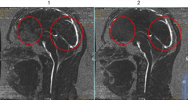 | 2 | Phase Contrast images acquired with Cine PC and SPGR Mode User CV set to 1, or On. Note the improved suppression of background tissue. |