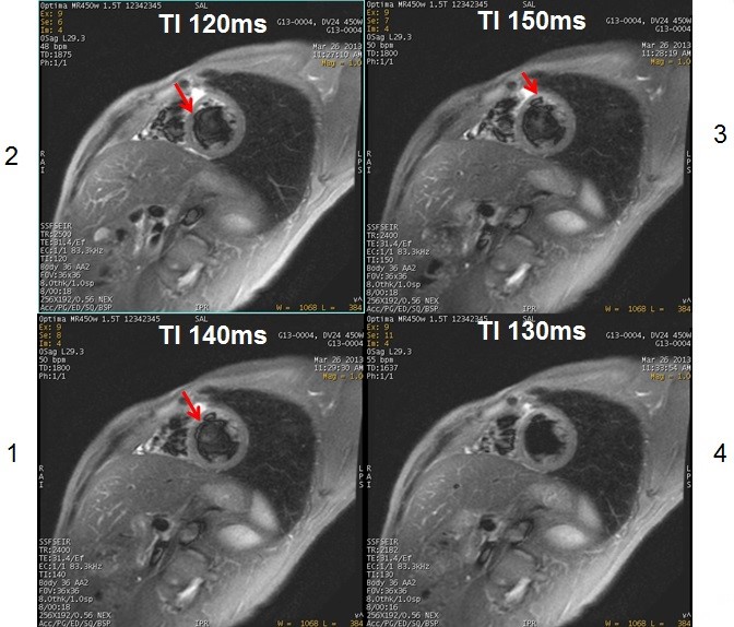 Table 2. Image legend Number Description 1,2,3 Note: the out-of-phase artifact seen when the TI is set to 120 ms, 140 ms and 150 ms.4 Optimum image quality when the TI is set to 130 ms.
