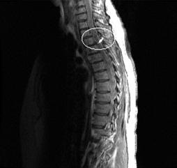 The FSE sagittal thoracic spine image below presents a Star artifact. The image was acquired with spine48, 28 cm FOV, and the phase and frequency swapped. The artifact could have been prevented by not swapping phase and frequency and using a 2-tile selection, such as spine32 so the surface coil coverage would closer match the scan FOV.