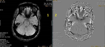 Table 2. Image legend Number Description 1 SWAN reformatted image that shows area of low signal due to inhomogeneity of anatomy. 2 Reformatted phase image shows non-optimal phase un-wrapping at the inhomogeneous region of anatomy. - When Phase images are generated, a prospective Phase series (described as FILT_PHA) appears in the patient list. For details, Series numbering. Reformatted images can be generated from this series.