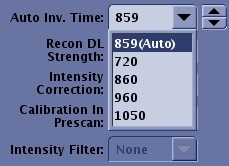 From the Inversion Time menu, select Auto. As you change other scan parameters, the Auto TI value is adjusted to provide the optimum TI for the scan prescription. Once you select Auto, the screen parameter name changes to indicate that Auto is selected and the Inversion Time value is displayed in the text field.
