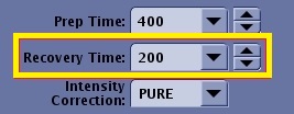 The Recovery Time is available with Silenz and BRAVO/MP-RAGE application. You can either type in a value or select a value from the menu. Hover the mouse over the field to view the minimum and maximum values. For details, see BRAVO: scan procedure and MP-RAGE scan procedure.