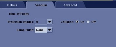 The Vascular TOF tab only appears if the protocol is a TOF pulse sequence. Only the vascular selections that are compatible with the active protocol display on the Vascular tab.