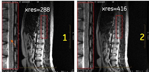 • Increase the matrix values to 256 x 256 or 512 x 512 to apply full k-space data acquisition.