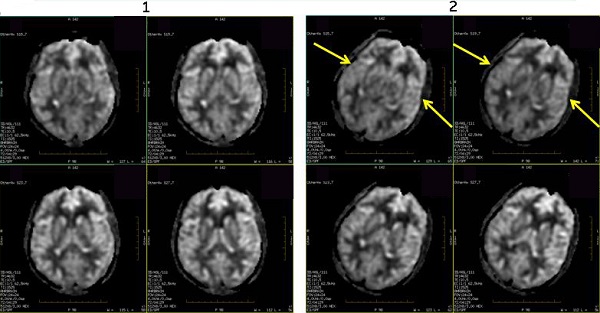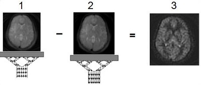 Two sets of images are acquired: one with the spatially selective inversion pulse (inverted blood) and one without the spatially selective inversion pulse (non-inverted blood). These two data sets are subtracted, which removes signal from the static background and the result is images that are proportional to cerebral blood flow. Multiple data sets are acquired to make a CBF image.