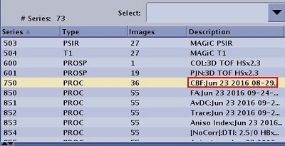 • Post-processed images are labeled as PROC and the description includes CBF.