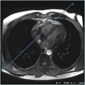 On the axial or oblique-axial localizer images, prescribe a vertical long axis view of right chambers with a shim volume that covers the heart.