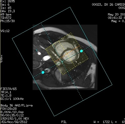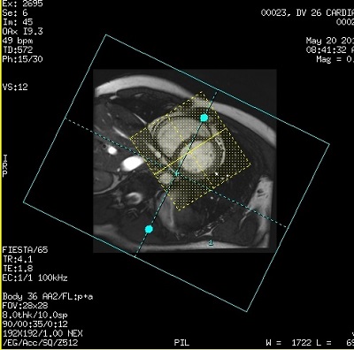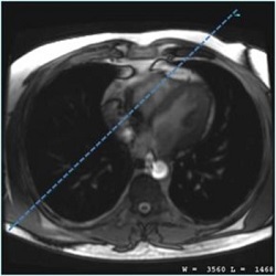 On the axial or axial-oblique localizer, prescribe a vertical long-axis scan plane of the right chambers. Figure 1. Example of slice position