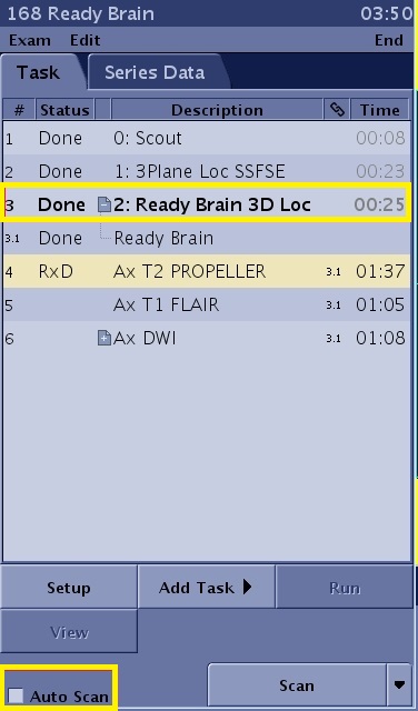 • Only select Auto Save if it is not necessary to check the Ready Brain scan prior to acquiring the linked tasks.