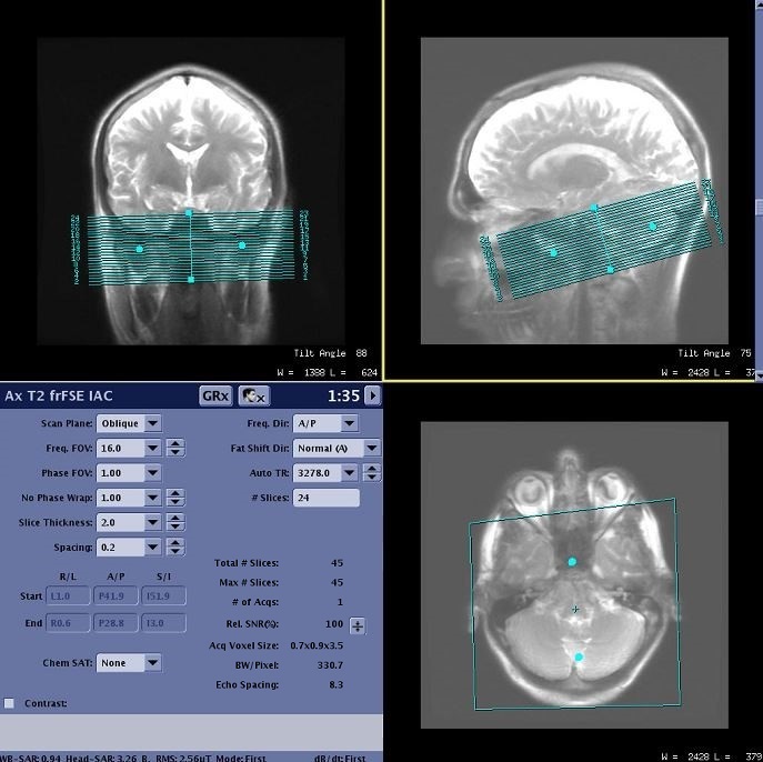 2. Acquire a whole brain, 2D 3-plane FGRE, or SSFSE localizer. SSFSE localizer is preferred to ensure the best results. The 3-plane localizer must meet the following criteria: